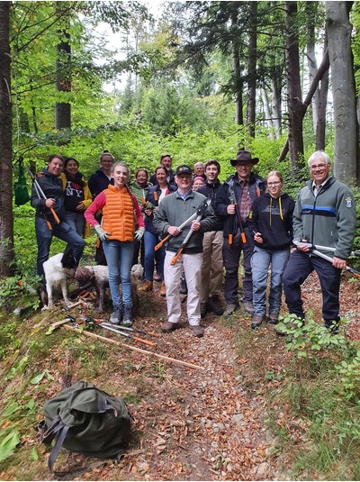 Dieses Jahr hieß es nachzuschauen, was aus der Weißtannenpflanzung geworden ist. Förster Robert Nörr von der Bayrischen Forstverwaltung begrüßte 15 Rotarier, deren Familienmitglieder und Rotaractler. Nach fachlicher Einführung in das richtige Schneiden der Umgebung der Setzlinge und das anschließende Richten der Pfähle und Drähte ging es bei noch trockenem Wetter in den Steilhang. Es war erstaunlich, dass die Setzlinge nur wenige 5 -7 cm gewachsen waren, während die Buchen rundherum ein Vielfaches zugelegt hatten. Nach getaner Arbeit versammelte sich das Team bei Brotzeit und Getränken im Wald und Förster Nörr informierte kenntnisreich über die verschiedenen Aspekte des Waldbestandes. Der Klimawandel hat den Wald erreicht und die Auswirkungen sind erheblich. Sinnvolle Gegenmaßnahmen wirken nur langfristig und so gibt es nur die Möglichkeit, sich durch eine Vielfalt von Baumarten auf die Zukunft vorzubereiten. Wir werden in einem Jahr sowohl bei den Weißtannen als auch bei dem viralen Pflänzchen wieder nachschauen, wie sie sich weiterentwickelt haben.